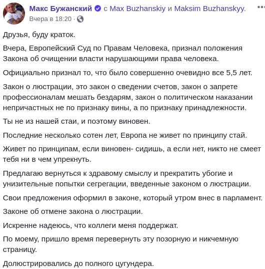 На своей странице в Facebook Бужанский написал, что 17 октября Европейский суд по правам человека признал положения закона об очищении власти нарушающими права человека.
