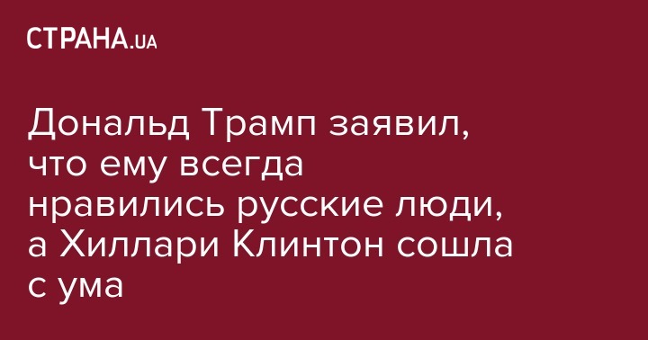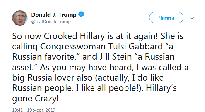 "Итак Кривая Хиллари снова в этом! Она называет конгрессвумен Тулси Габбард "русским фаворитом", а Джилл Стейн - "русским активом". Как вы, наверное, слышали, меня тоже называли большим любителем России (на самом деле, мне нравятся русские люди. Мне нравятся все люди). Хиллари сошла с ума!", - написал Трамп.