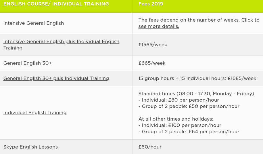 Цены на обучение в школе высокие - один час занятий английским по видеосвязи стоит 60 фунтов стерлингов (почти 2000 гривен), а "Обычный английский" для тех, кому за 30 лет, стоит 665 фунтов стерлингов (21,5 тысяч гривен) в неделю, интенсивный курс с индивидуальными занятиями и вовсе более полутора тысяч фунтов или более 50 тысяч украинских гривен в неделю.