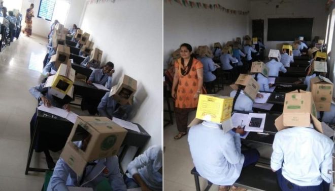 В Индии на фото попали учащиеся колледжа, которые сдают экзамены с картонными коробками на головах.