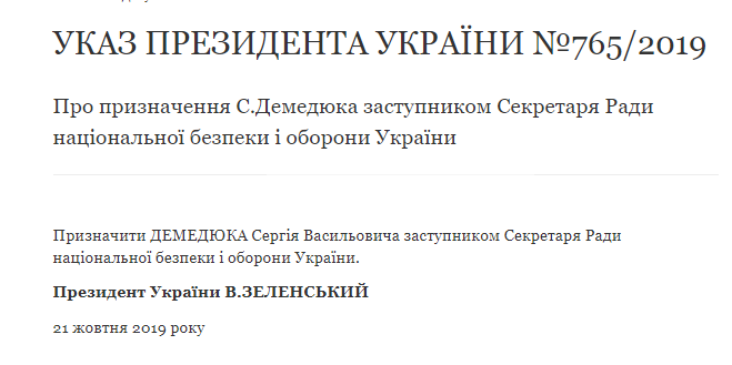 "Назначить Демедюка Сергея Васильевича заместителем секретаря Совета национальной безопасности и обороны Украины", - говорится в указе №765/2019 от 21 октября.