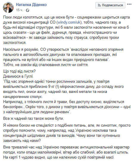 "Если принимать во внимание сезон массового опадения листьев, количества выкопанной сухой ботвы на огородах, подготовки городов и полей к зимнему периоду, огромные масштабы курения, на пещерном уровне - сознание многих граждан, почти полное отсутствие наказания за сжигания травы, бездействие соответствующих структур в хотя бы регулярных предупреждениях и объяснениях, то картина выглядит печальной", - написала Наталья Диденко.