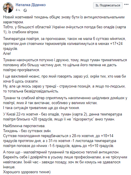 "А пока - маловетренный туманный и относительно теплый антициклон. Берегите себя и доверяйте во всем только профессионалам, а не трескучим невеждам. Их время - всегда позади, как бы кому-то не казалось иначе", - написала Диденко.