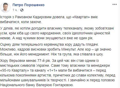 "История с Рамзаном Кадыровым доказала, что "Квартал" умеет извиняться, когда захочет", - заявил Порошенко (речь идет об извинениях Зеленского перед главой Чечни Кадыровым после шутки в 2014 году).