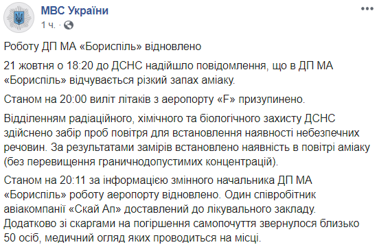"21 октября в 18:20 в ГСЧС поступило сообщение, что в "Борисполе" ощущается резкий запах аммиака.