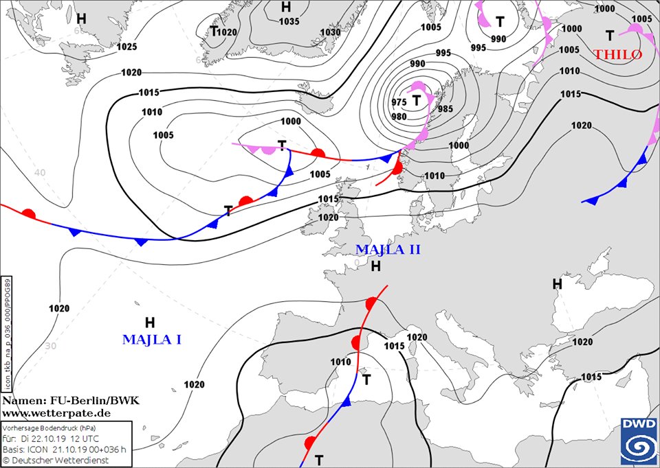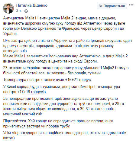 "Антициклон Majla1 и антициклон Majla2, виднимо, мама с дочкой, определяют широкой полосой сухую погоду от Атлантики через узкое горло между Великобританией и Францией, через центр Европы и до Украины. Уже завтра циклон с севера Африки и из районов Ирландии отправятся друг другу навстречу, перекроют дождями и ветром тихий разговор антициклонов. Мама Majla1 останется изолированной над Атлантикой, а дочь Majla2 будет определять сухую погоду в центре и на востоке Европы", - написала Наталья Диденко.