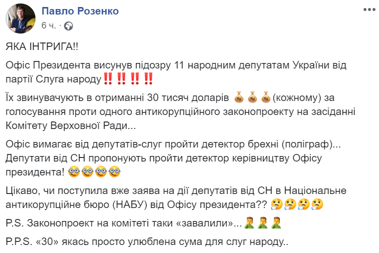"Их обвиняют в получении 30 тысяч долларов (каждому) за голосование против одного антикоррупционного законопроекта на заседании Комитета Верховной Рады... Офис требует от депутатов-слуг пройти детектор лжи (полиграф)", - отмечается в опубликованном сообщении.