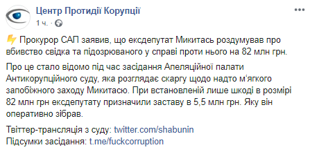 Во вторник, 22 октября, в ходе заседания Апелляционной палаты Антикоррупционного суда, которая рассматривает жалобу на меру пресечения экс-главы строительной корпорации Укрбуд Максима Микитася, прокурор заявил, что подозреваемый размышлял об убийстве свидетеля в деле против него. Об этом в Facebook сообщает Центр противодействия коррупции.
