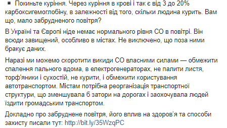 Также Ульяна Супрун напомнила, что в Украине и Европе нет нормального уровня СО в воздухе. Он везде завышен, особенно в городах.