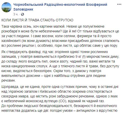 "К проблеме человеческой безответственности, безнаказанности и экологического невежества добавились еще две: погодные условия – антициклон с отсутствием ветров и туманов, который поддерживает воздух с вредными выбросами, и массовое горение торфяников. Например, последнее возгорание зафиксировано вблизи села Феневичи Иванковского района на площади 5 гектаров", - пишет заповедник.