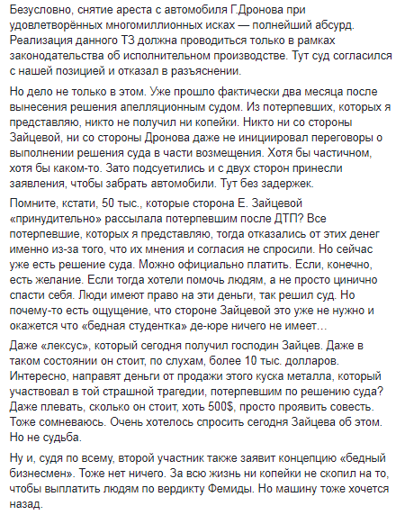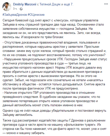 "Сегодня Киевский суд снял арест с Lexus, которым управляла Зайцева в ночь страшной трагедии два года назад. Основанием стало заявление собственника имущества - господина Зайцева (отец Елены - Ред.). На заседание ни он, ни его представитель не явились. В судебном заседании мы указали, что по заявлению потерпевших открыто новое уголовное производство и данный автомобиль может стать полезен именно в нем. Однако суд не счёл наши доводы убедительными и постановил вернуть Зайцеву автомобиль", - написал Марцони.