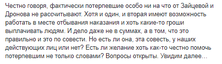 "Никто ни со стороны Зайцевой, ни со стороны Дронова даже не инициировали переговоры о компенсации. Хотя бы частичной, хотя бы какой-то. Честно говоря, фактически потерпевшие особо ни на что от Зайцевой и Дронова не рассчитывают. Хотя и один, и вторая имеют возможность работать в месте отбывания наказания и хоть какие-то гроши выплачивать людям. И дело даже не в суммах, а в том, что это правильно и это по совести", - сообщил Марцони.