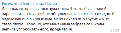 По предварительным данным, ученица 12-летняя ученица одного из 7 классов школы разбежалась и выпрыгнула из окна самостоятельно. Об этом говорят другие школьники. Так, ученица параллельного класса написала о том, что пострадавшая сделала это самостоятельно в одном из киевских Telegram-каналов. В том, соответствует ли эта информация действительности, разбираются правоохранители.