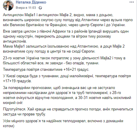 В начале следующей недели в Украину придет ощутимое похолодание, а уже 30-31 октября возможет мокрый снег. Об этом сообщила синоптик Наталья Диденко на своей странице в Facebook.