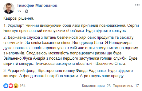 "Государственная служба по вопросам безопасности пищевых продуктов и защиты потребителей. По своему желанию ушел Владимир Лапа... Уволен Жук Андрей с должности первого заместителя главы службы... Временно исполняющим обязанности - Шевченко Ольга", - написал Милованов.