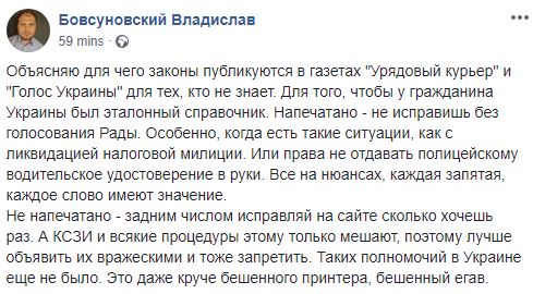 "Объясняю, для чего законы публикуются в газетах "Урядовый курьер" и "Голос Украины" для тех, кто не знает. Для того, чтобы у гражданина Украины был эталонный справочник. Напечатано - не исправишь без голосования Рады. Особенно, когда есть такие ситуации, как с ликвидацией налоговой милиции. Или права не отдавать полицейскому водительское удостоверение в руки", - пишет он.
