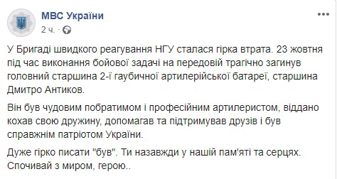 Согласно ему, старшина 2-й гаубичной артиллерийской батареи Дмитрий Антыков погиб во время выполнения боевого задания на передовой.