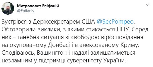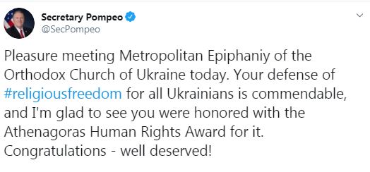 В своем Twitter Помпео заявил, что защита свободы вероисповедания для всех украинцев со стороны Епифания заслуживает похвалы. Также госсекретарь поздравил митрополита с получением награды "Athenagoras Human Rights Award".
