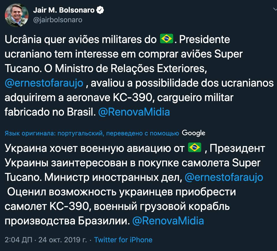 Президент Украины Владимир Зеленский заинтересован в покупке бразильских самолетов Super Tucano и готов рассмотреть возможность приобретения Embraer KC-390. Об этом написал президент Бразилии Жаир Болсонару в Twitter.