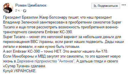 "Super Tucano – может это неплохой вариант за небольшие деньги для переоснащения ВВС Украины, если ракет наших подвесить... А вот Embraer KC-390 – точно нет. Это аналог нашего Ан-178. Если Минобороны и МВД закупят эти самолёты, то это вдохнет новую жизнь в Государственное предприятие "Антонов". А дальше гляди и своего "Супер Тукана" сделаем. Покупай украинское!" - написал Цимбалюк.