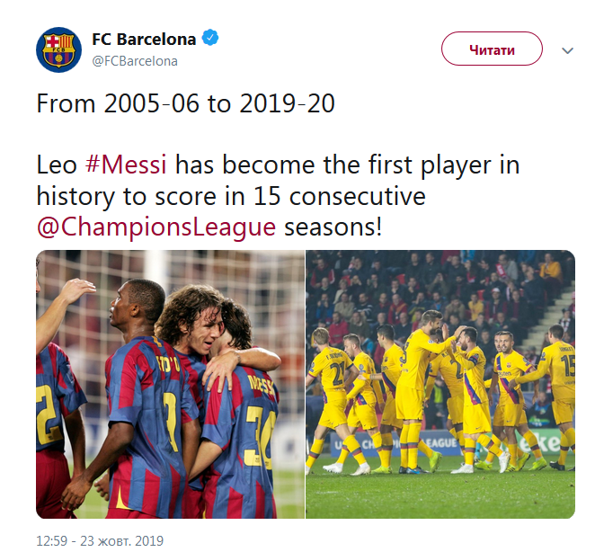 А вот гол Лео Месси стал не только его первым забитым мячом в этом сезоне Лиги чемпионов но и побил сразу два рекорда, как передает официальный Twitter клуба.
