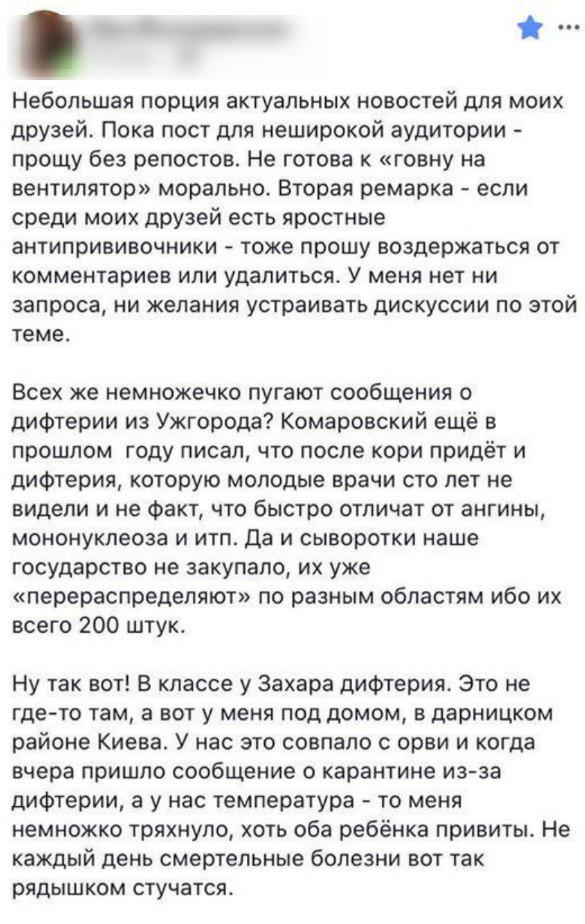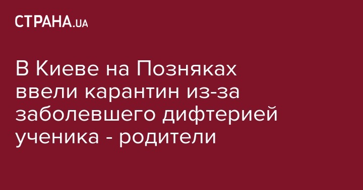 В Киеве в одной из школ на Позняках объявили карантин из-за дифтерии. Об этом на своей странице в соцсети написала киевлянка-родитель столичного ученика. По ее словам несколько дней назад заболел школьник, у которого не было прививки от дифтерии. Сегодня его диагноз уже лабораторно подтвержден.