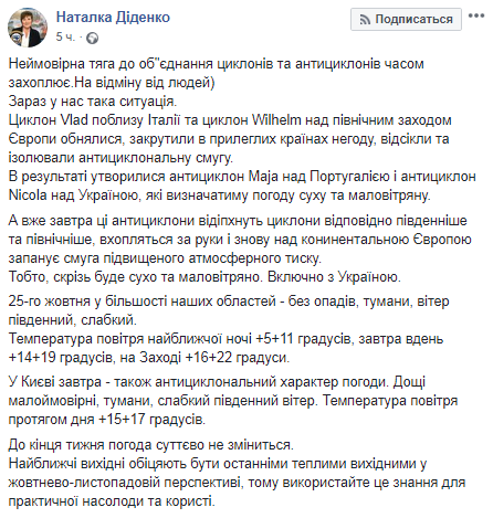 "Циклон Vlad вблизи Италии и циклон Wilhelm над северо-западом Европы обнялись, закрутили в прилегающих странах непогоду, отсекли и изолировали антициклональную полосу. В результате образовались антициклон Maja над Португалией и антициклон Nicola над Украиной, которые будут определять сухую и маловетреную погоду. А уже завтра эти антициклоны оттолкнут циклоны соответственно южнее и севернее, ухватятся за руки и снова над континентальной Европой воцарится полоса повышенного атмосферного давления", - написала Диденко.