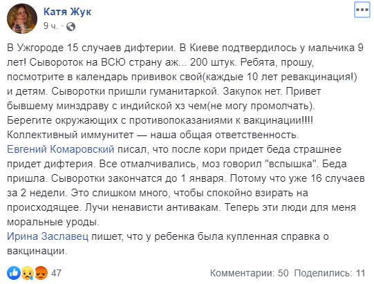Евгений Комаровский писал, что после кори придет беда страшнее придет дифтерия. Все отмалчивались, МОЗ говорил "вспышка". Беда пришла. Сыворотки закончатся до 1 января. Потому что уже 16 случаев за 2 недели. Это слишком много, чтобы спокойно взирать на происходящее. Лучи ненависти антивакам. Теперь эти люди для меня моральные уроды.