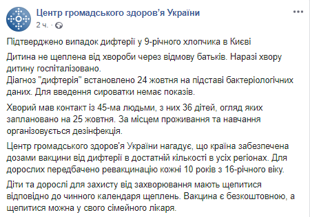 "В Ужгороде 15 случаев дифтерии. В Киеве подтвердилось у мальчика 9 лет! Сывороток на ВСЮ страну аж... 200 штук. Ребята, прошу, посмотрите в календарь прививок свой (каждые 10 лет ревакцинация!) и детям. Сыворотки пришли гуманитаркой. Закупок нет. Привет бывшему минздраву с индийской хз чем (не могу промолчать).