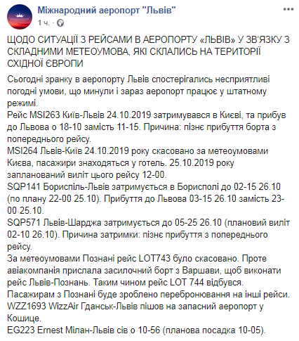 Рейс из Львова до Киева (MSI264), который должен был осуществиться 24 октября, но был отменен из-за метеоусловий в Киеве, запланирован на вылет 25 октября в 12:00.