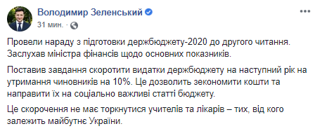 Расходы госбюджета-2020 на содержание чиновников хотят сократить на 10 %. Такую задачу поставил президент Владимир Зеленский министрам. Об этом глава государства написал на своей странице в соцсети.