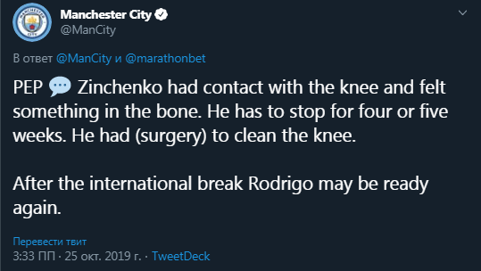"Зинченко повредил колено и почувствовал что-то в кости. Он пропустит четыре или пять недель. Ему пришлось сделать операцию по очистке колена", - цитирует пресс-служба слова главного тренера "Манчестер Сити" Хосепа Гвардиолы.