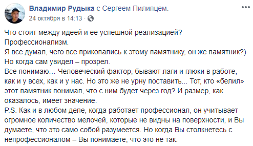 "Что стоит между идеей и ее успешной реализацией? Профессионализм. Я все думал, чего все прикопались к этому памятнику, он же памятник? Но когда сам увидел – прозрел. Все понимаю… Человеческий фактор, бывают лаги и глюки в работе, как и у всех, как и у нас. Но это же не урну поставить... Тот, кто "белил" этот памятник понимал, что с ним будет через год? И размер, как оказалось, имеет значение", - отметил Владимир Рудыка.