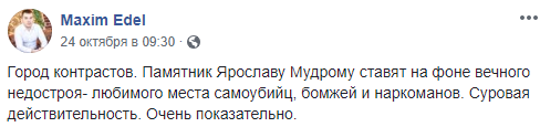 "Город контрастов. Памятник Ярославу Мудрому ставят на фоне вечного недостроя- любимого места самоубийц, бомжей и наркоманов. Суровая действительность. Очень показательно", - добавил в сети Maxim Edel.