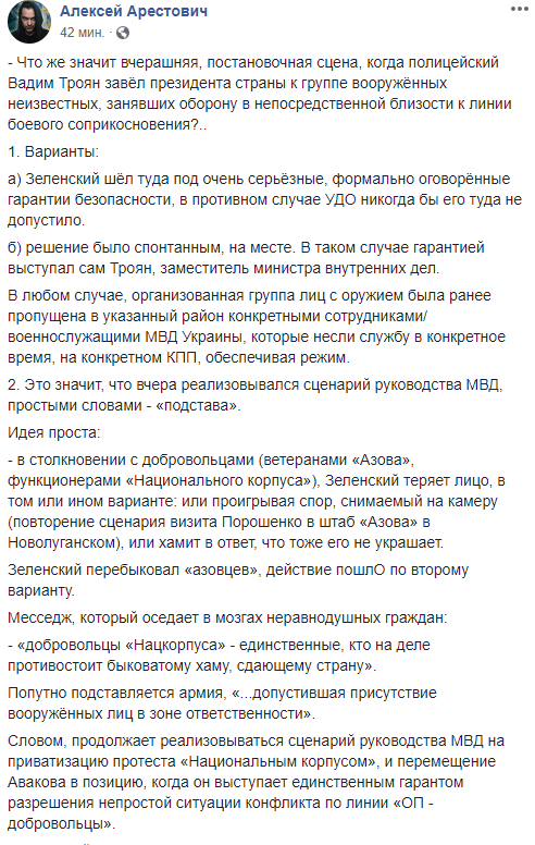 "Что же значит вчерашняя, постановочная сцена, когда полицейский Вадим Троян завел президента страны к группе вооруженных неизвестных, занявших оборону в непосредственной близости к линии боевого соприкосновения?