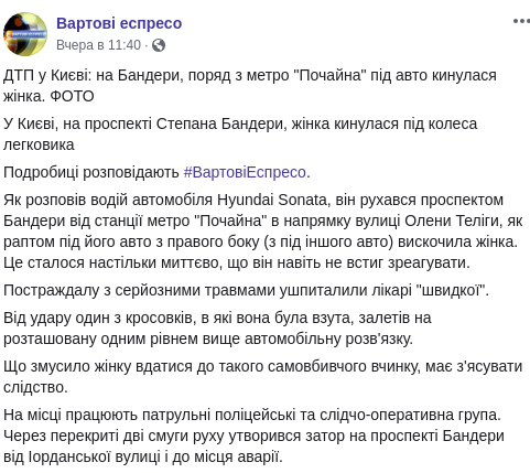 В Киеве на проспекте Степана Бандеры, женщина бросилась под колеса легковушки. Об этом в Facebook сообщила группа Вартові еспресо.