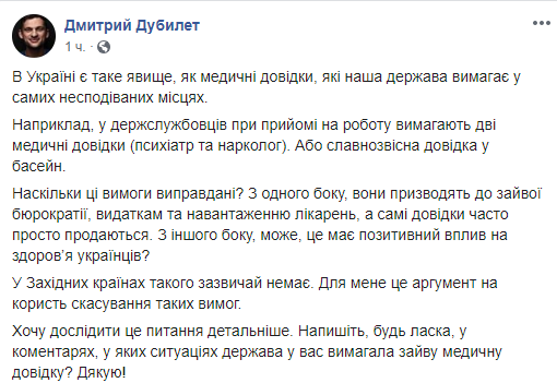 За отмену такого документа, как медицинская справка выступил министр Кабинета Министров Дмитрий Дубилет. Об этом он написал на своей странице в соцсети Facebook.