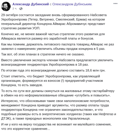 "Конечно же, не менее важной частью стратегии этого развития для Абромавичуса является размер его заработной платы и бонусов. Абромавичус не раз заявлял о намерениях увеличить объемы продаж концерна в 5 раз. Так вот, об этих планах в стратегии ничего не сказано. Вместо увеличения экспорта членам набсовета предлагается увеличить вознаграждение гендиректора "Укроборонпрома" в 18 раз", - написал Дубинский.