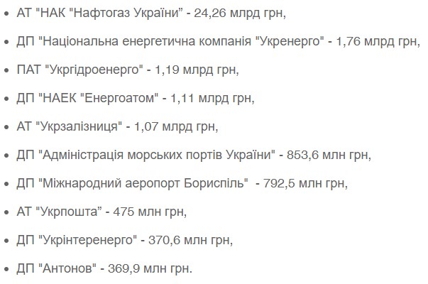 Уточняется, что в сумме 10 госкомпаний заработали более 32 миллиардов гривень чистой прибыли. Подавляющее большинство прибыли заработал НАК Нафтогаз - около 75 % от всей суммы. За ним следуют энергетические предприятия: "Укрэнерго", "Укргидроэнерго" и "Энергоатом". Укрзализныця заработала более 1 милллиарда и заняла 5 место. Администрация морских портов - 853,6 миллиона.