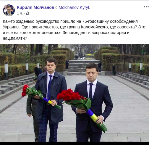 "Как-то жиденько руководство пришло на 75-годовщину освобождения Украины. Где правительство, где группа Коломойского (к ней причисляют Богдана - Ред.), где соросята (так называют членов правительства, включая Гончарука - Ред.)? Это и все на кого может опереться Зепрезедент в вопросах истории и нац.памяти?" - прокомментировал фото политолог Кирилл Молчанов на своей странице в Facebook.