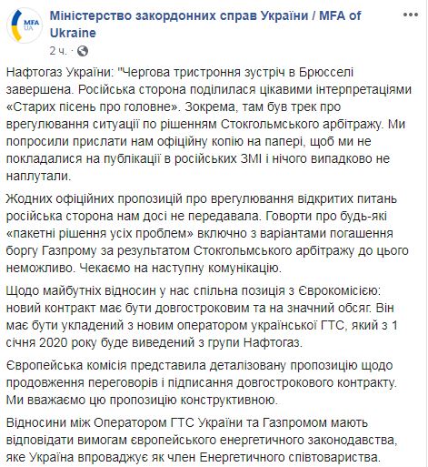 "Теперь имеем общую с Еврокомиссией позицию: новый контракт должен быть долгосрочным и на значительный объем. Он должен быть заключен с новым оператором украинской газотранспортной системы, который с 1 января 2020 года будет выведен из группы Нафтогаз (процесс анбандлинга). Отношения между оператором ГТС Украины и Газпромом должны отвечать требованиям европейского энергетического законодательства, которые Украина внедряет как член Энергетического сообщества", - заявили в МИД.