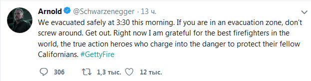"Мы благополучно эвакуировались в 03:30 утра. Если вы находитесь в зоне эвакуации, не облажайтесь. Убирайтесь. Прямо сейчас я благодарю лучших пожарных в мире, настоящих героев боевиков, которые сражаются с угрозой, чтобы защитить своих собратьев-калифорнийцев", - написал Арнольд Шварценеггер.