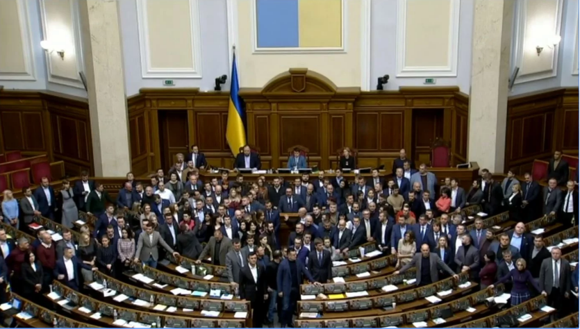 Нардепы из "Слуги народа" собрались возле трибуны ВР в знак протеста против угроз Федыны Зеленскому. Фото