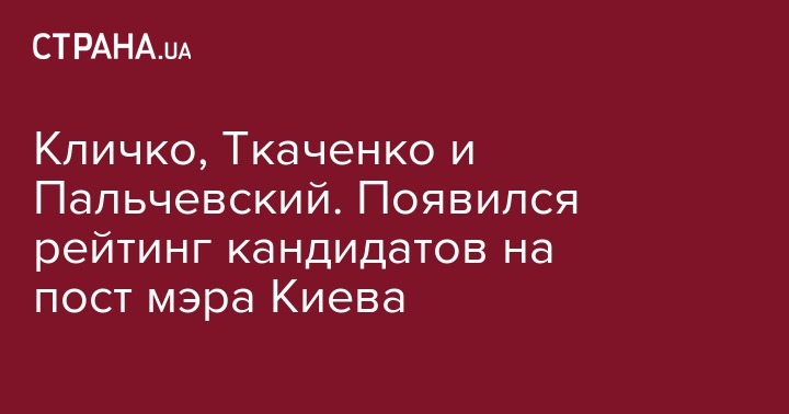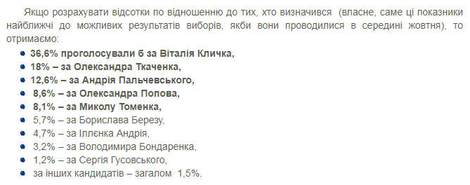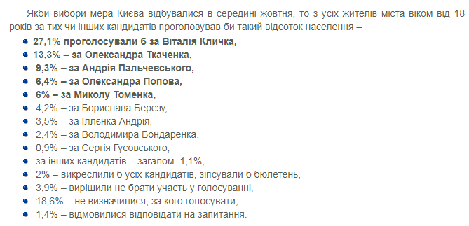 Среди тех, кто определился со своим выбором, 36,6% проголосовали бы за Виталия Кличко, 18% – за Александра Ткаченко и 12,6% – за телеведущего Андрея Пальчевского. Еще 8,6% отдали бы свой голос за Александра Попова, который возглавлял Киевскую администрацию в 2010-2013 годах, 8,1% – за экс-нардепа Николая Томенко и 5,7% – за экс-нардепа Борислава Березу.