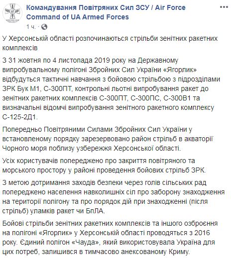 "С 31 октября по 4 ноября 2019 года на государственном испытательном полигоне вооруженных сил Украины "Ягорлык" пройдут тактические учения с боевой стрельбой с подразделениями ЗРК Бук М1, С-300ПТ, контрольные летные испытания ракет к зенитным ракетным комплексам С-300ПТ, С-300ПС, С-300В1 и определяющие ведомственные испытания зенитного ракетного комплекса С-125-2Д1", - говорится в сообщении.