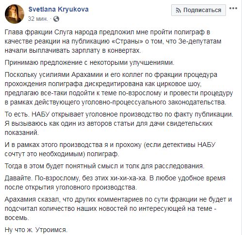 "Поскольку усилиями Арахамии и его коллег по фракции процедура прохождения полиграфа дискредитирована как цирковое шоу, предлагаю все-таки подойти к теме по-взрослому и провести процедуру в рамках действующего уголовно-процессуального законодательства", - написала Крюкова в Facebook.