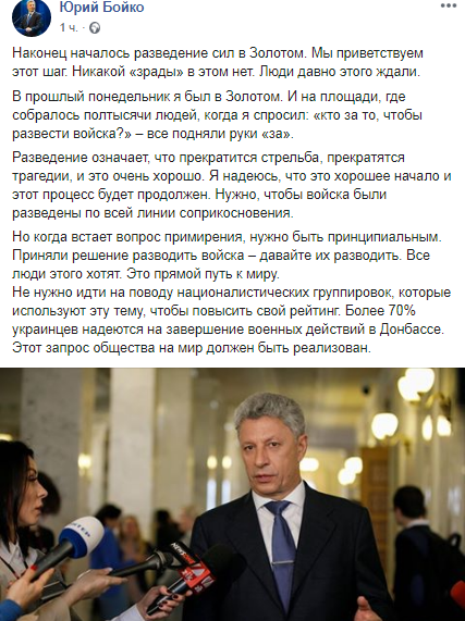 "Мы приветствуем этот шаг. Никакой "зрады" в этом нет. Люди давно этого ждали. В прошлый понедельник я был в Золотом. И на площади, где собралось полтысячи людей, когда я спросил: "кто за то, чтобы развести войска?" – все подняли руки "за"", - написал Юрий Бойко.