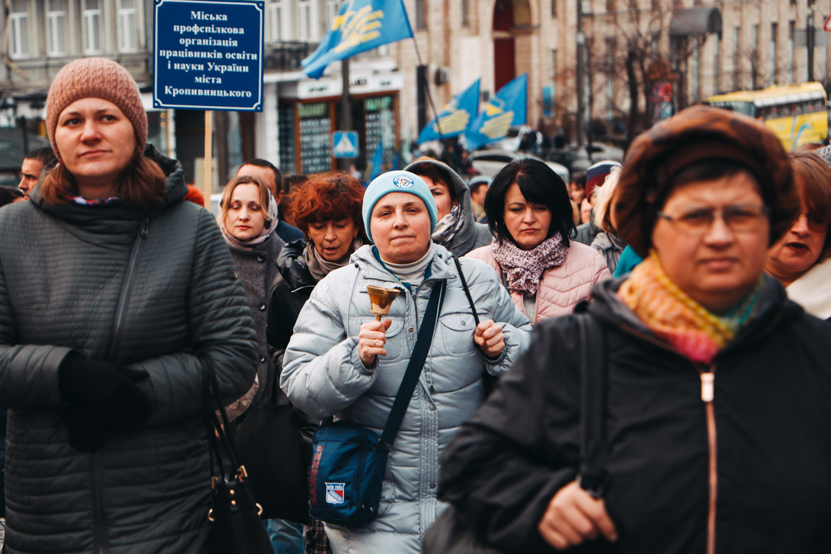 На Европейской площади люди вышли на проезжую часть. В связи с этим часть улицы Грушевского перекрыли, а на прилегающих - образовались пробки. В центр столицы съехали представители образования со всех районов города. Также были учителя и из других регионов. Все они вышли на акцию, чтобы отстоять свои надбавки и премии, так как правительство намеревается эти доплаты отменить.
