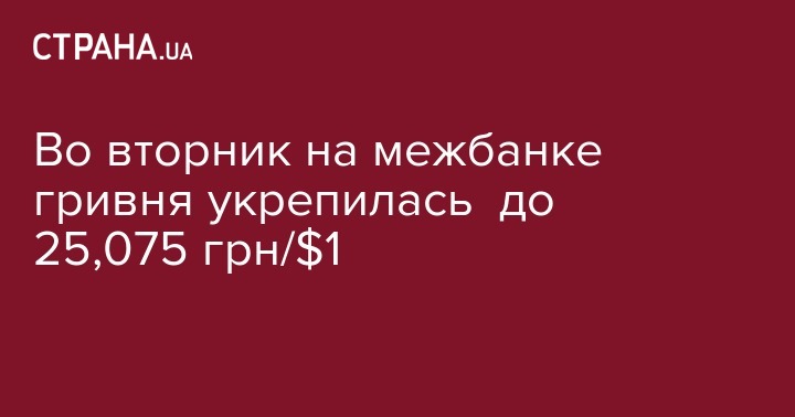 Во вторник на межбанке гривня укрепилась до 25,075 грн/$1