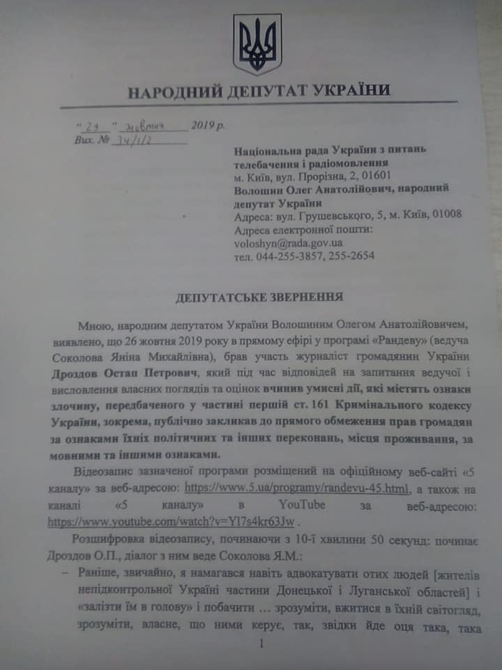 В этот раз на лицо разжигание ненависти к жителям огромного региона. Проверим, есть у Нацсовета, сформированного Порошенко, но полюбившегося и новой властью, хоть немного желания придерживаться закона", - написал Волошин в Facebook и опубликовал фотокопию своего обращения.